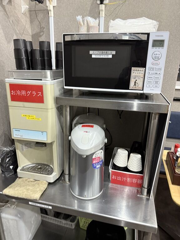 奥にコーナーにセルフで温め直し用の電子レンジと、割りスープのポットがあります。割りスープは専用の湯呑みに入れて各自の卓に持ち帰る仕組み。