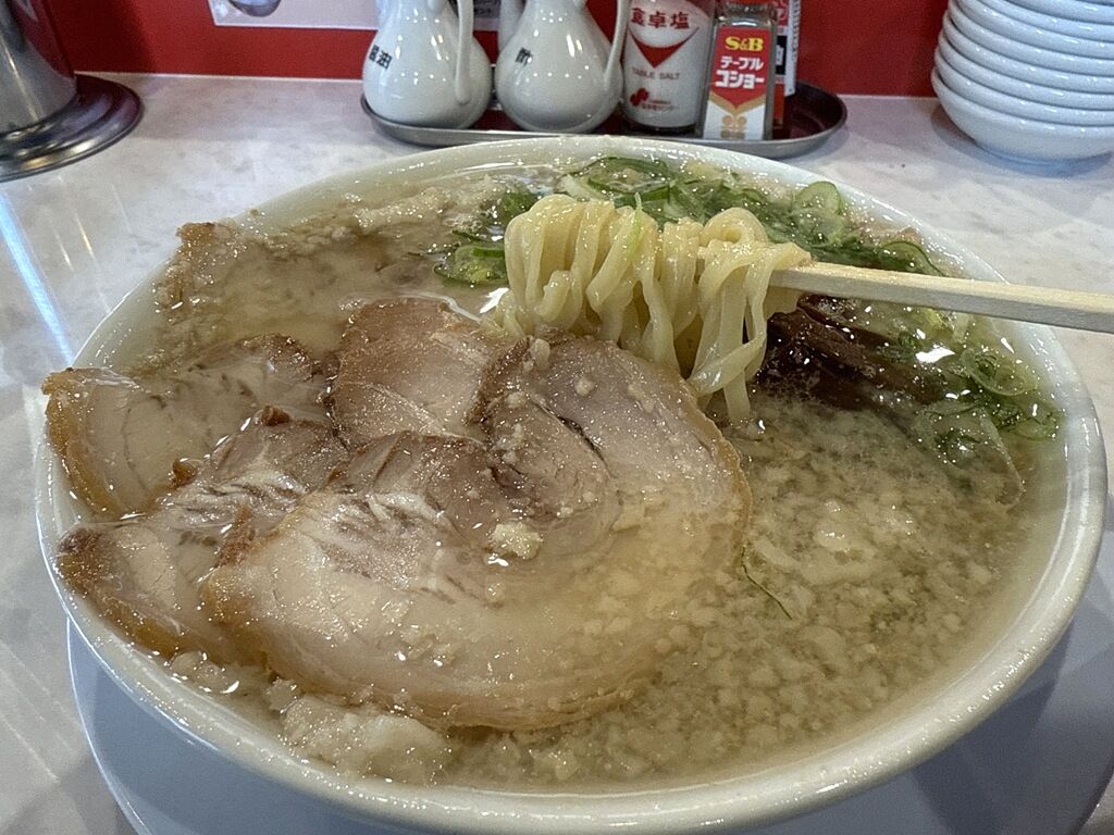そのスープは豚清湯でコクと旨味たっぷり。ちゃん系と似ていますが、ちゃん系ほど液状油は多くなく、スープ自体旨み強め。コクのある分かりやすいハッキリとした癖になる豚出汁で、一口目からウマってなるやつです。自家製唐辛子の辛味がとても良く会います。行列と人気も納得の味でとても美味しい!