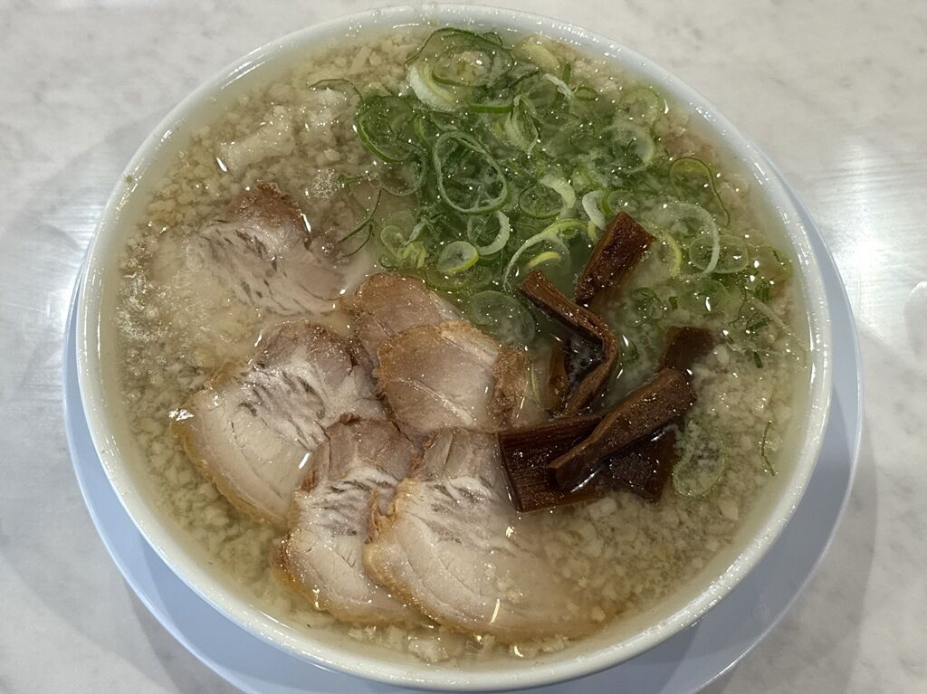 スープはさらさらの清湯塩味。熱々での提供。「こってり」指定で背脂たっぷり入り。その背脂ですが、比較的粒が大きめで、量も多く存在感があります。