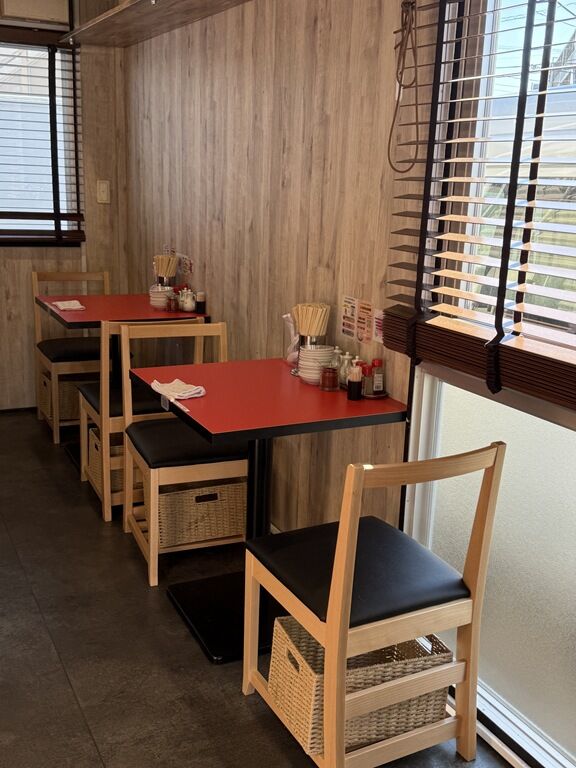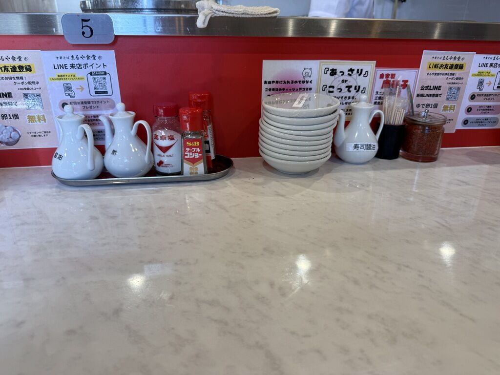 BGMはラジオ放送。箸は割り箸。卓上調味料は醤油、酢、S&Bテーブルコショー、チヨダラー油、寿司醤油、自家製唐辛子。