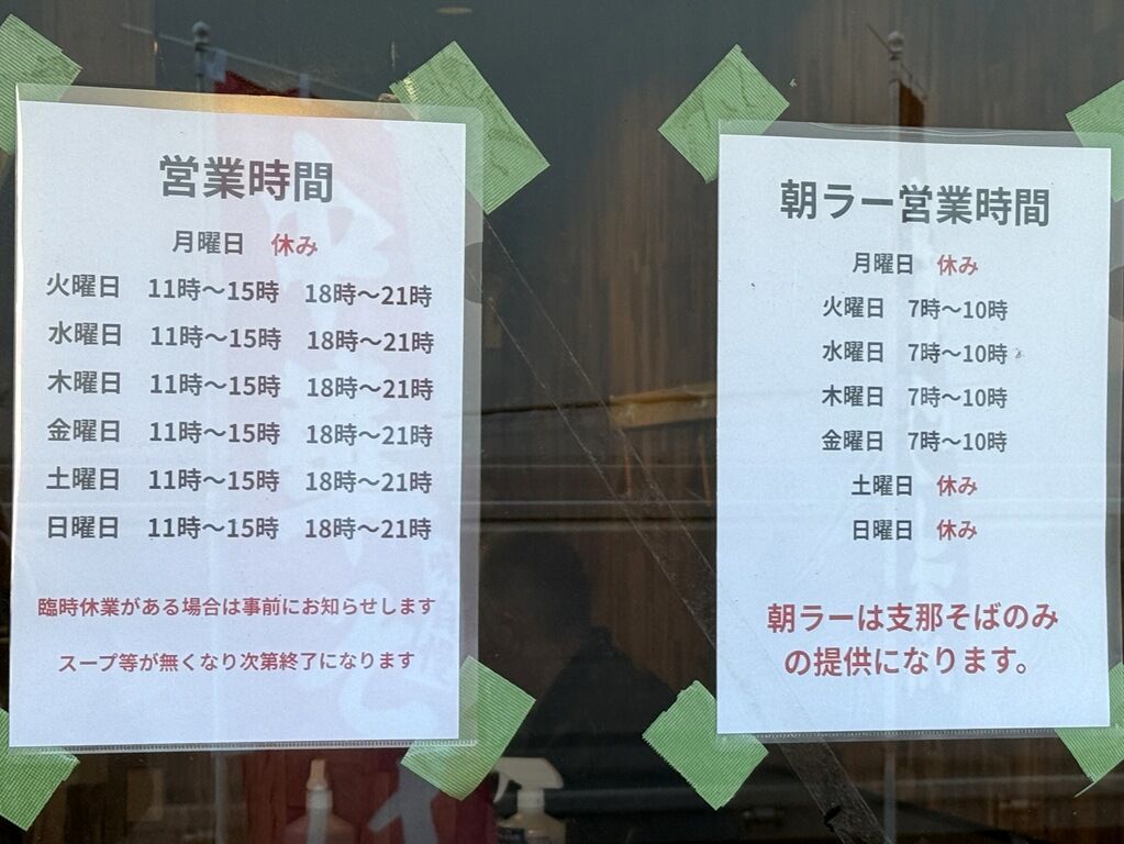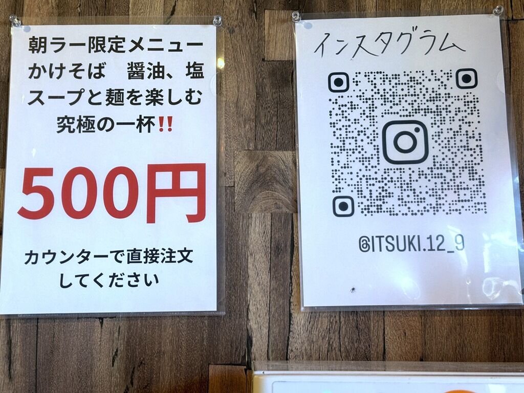 火~金7:00~10:00朝ラーメン(かけそば醤油・塩)500円の朝ラー営業もあり。