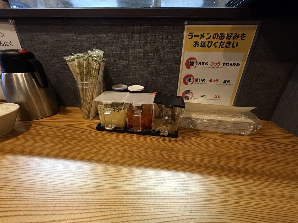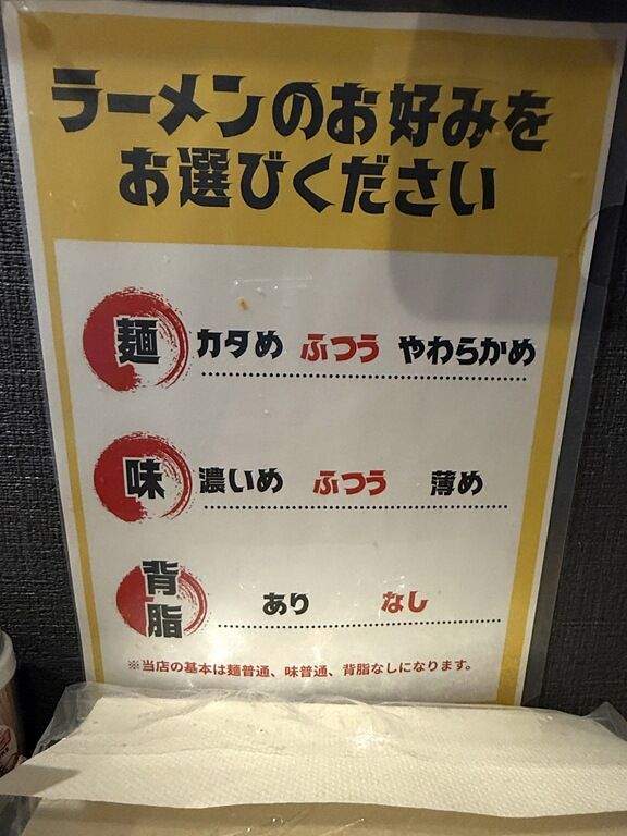 食券回収時お好み(麺の固さ、味の濃さ、背脂の有無)の確認があります(デフォは麺普通・味普通・背脂なし)。また調理開始後途中で、チャーシューをバラかロースのどちらにするか聞かれます。