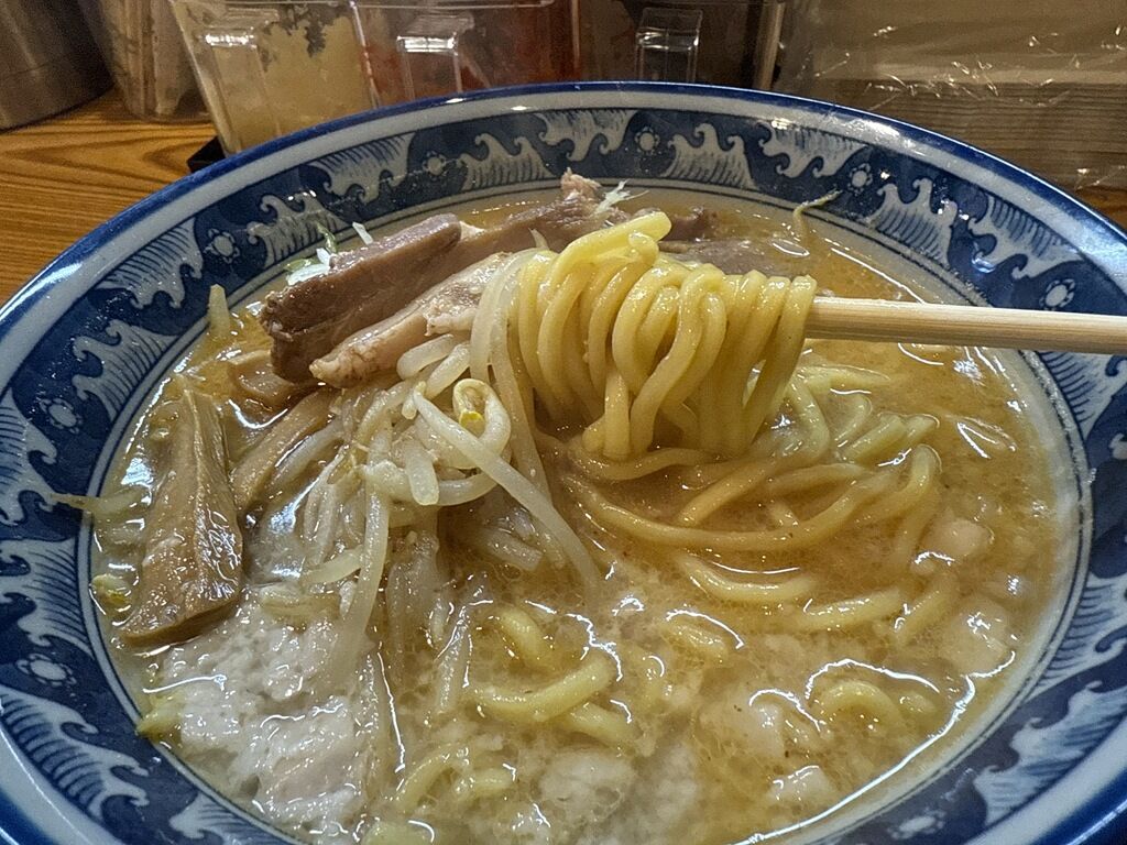 三河屋製麺製の麺は軽くウェーブの付いた中太タイプ。太めのもっちりとした麺が濃いめのスープに良く合います。