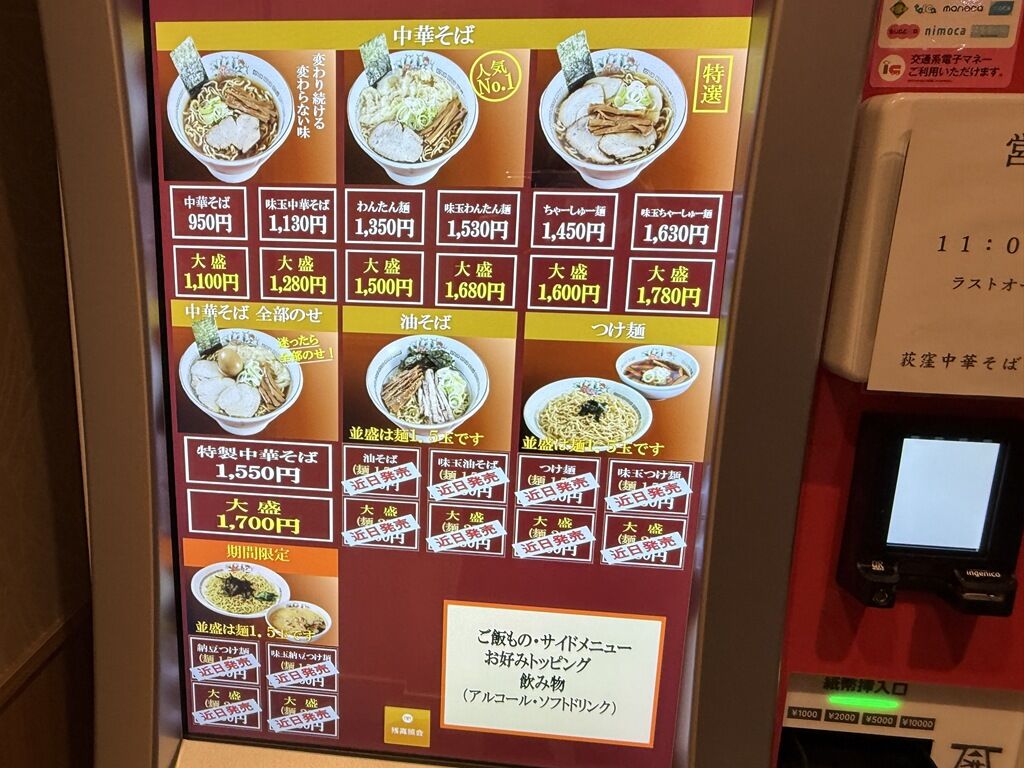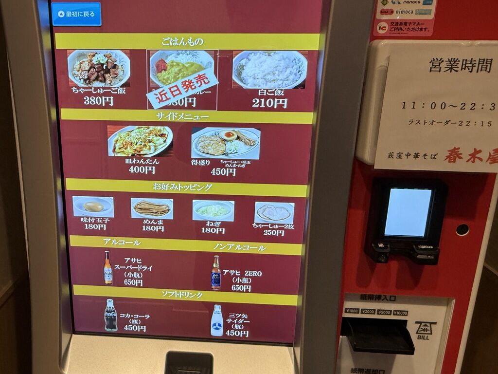 暖簾をくぐるとすぐ右手に券売機、まず食券購入です。なお、決済方式は現金及び交通系電子マネーに対応。