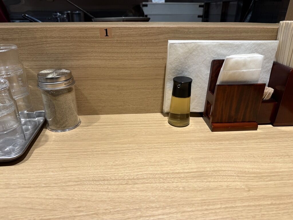 BGMはジャズ。箸は割り箸。卓上調味料は白胡椒、酢。紙エプロンも卓上に置かれています。