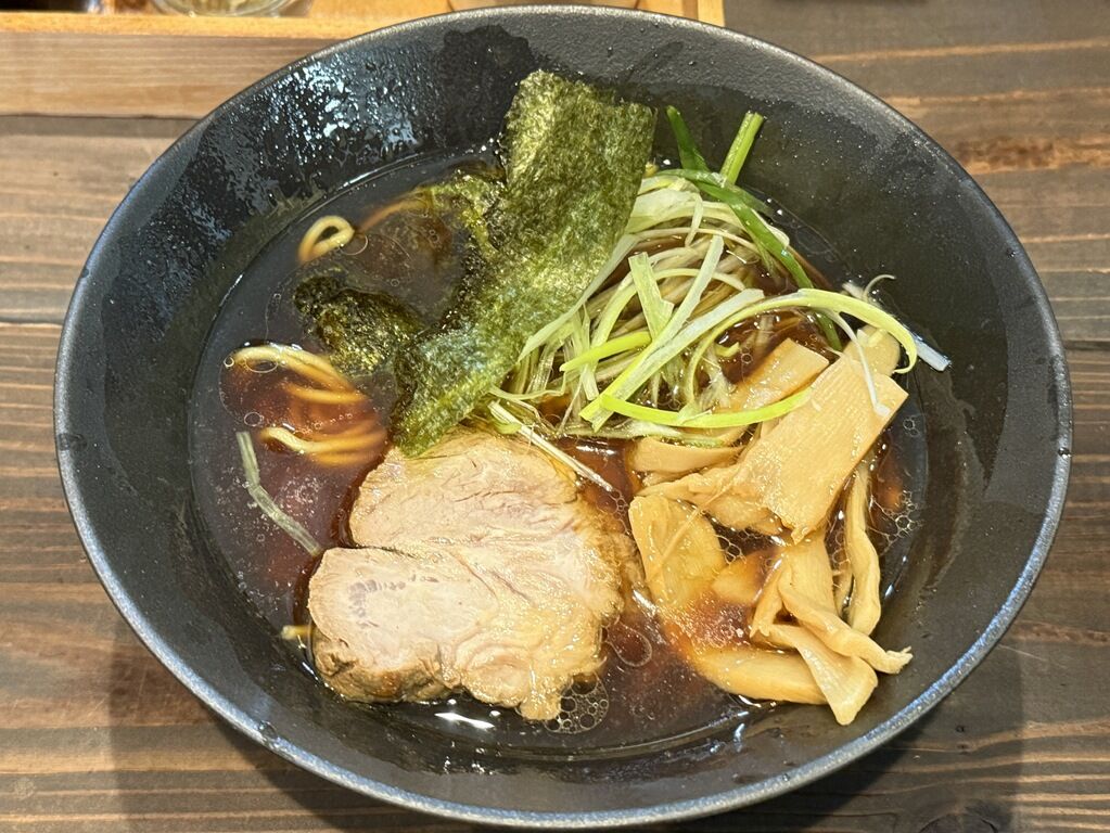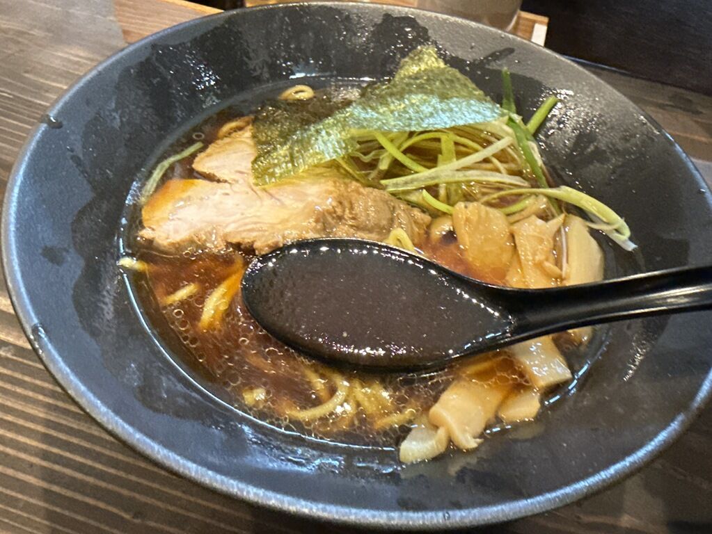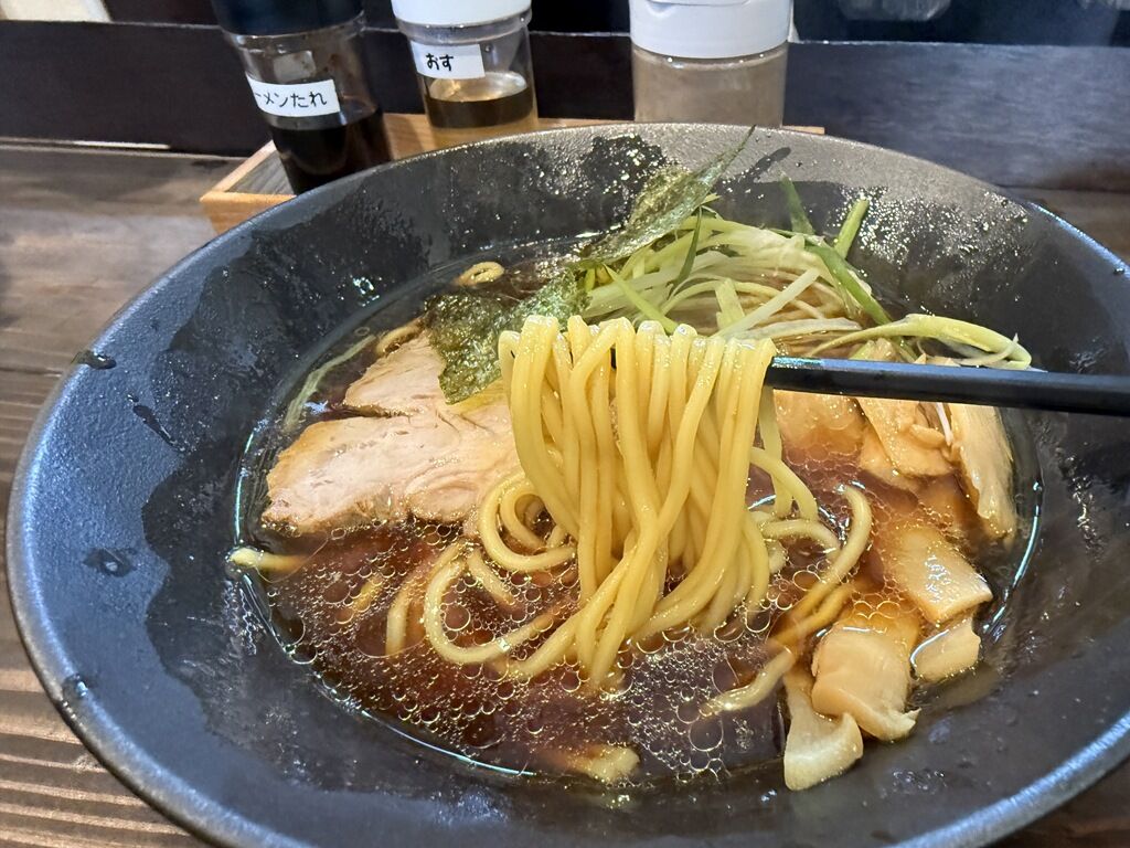 スープはさらさらの清湯醤油味。親どり・とりがら・もみじを弱火で4時間煮込んだという鶏出汁。タレは、野菜・魚介類を3時間弱火で煮込んだという黒だれ。鶏の出汁は良く出ています。香味油由来か特徴的な甘さが印象的。他にあまりないシンプルで素朴な味わいで美味しい!