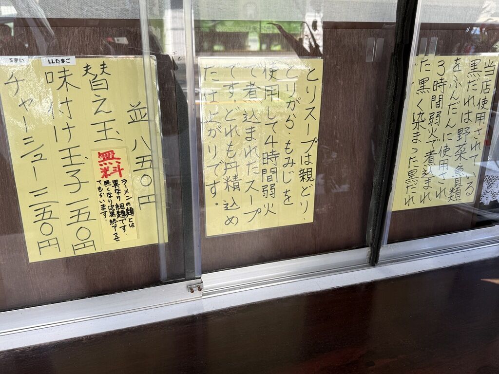 店頭には手書きの蘊蓄とメニュー。替え玉無料でラーメンとは異なる細麺とありましたが、この日から替玉は有料になったとのことです。