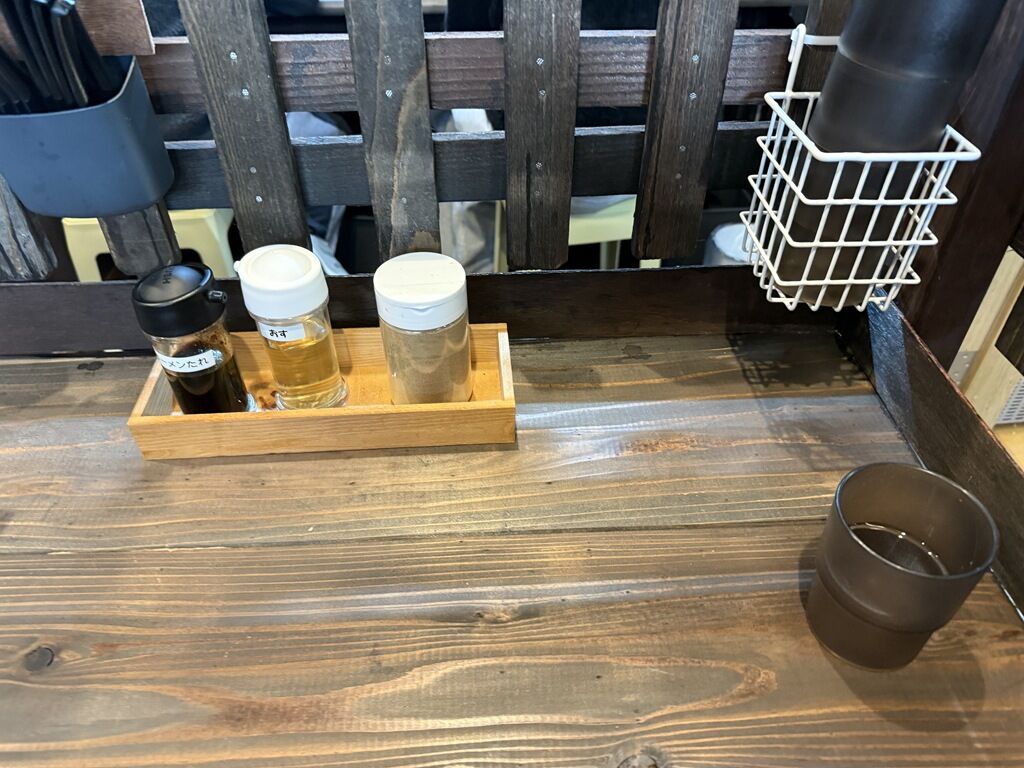 BGMは無し。箸は洗い箸でサスティナブルに配慮。卓上調味料はラーメンたれ、酢、胡椒。