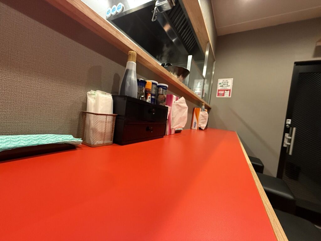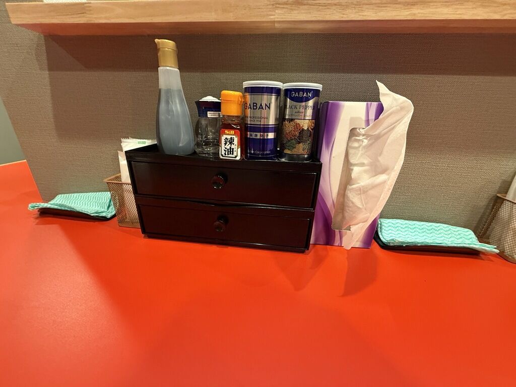 箸は割り箸。卓上調味料は醤油、ミル入りブラックペッパー、S&B辣油、GABAN一味唐辛子・ブラックペッパー。