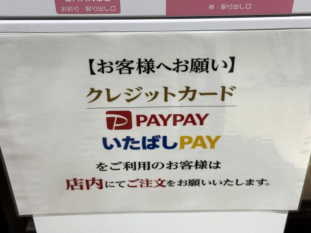 なお、券売機は現金のみ対応。クレカ、PayPay、いたばしPAYでの支払いの場合は、店内で注文とのこと。