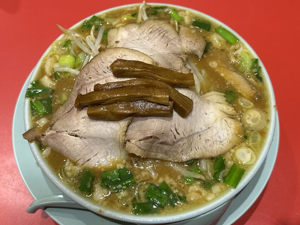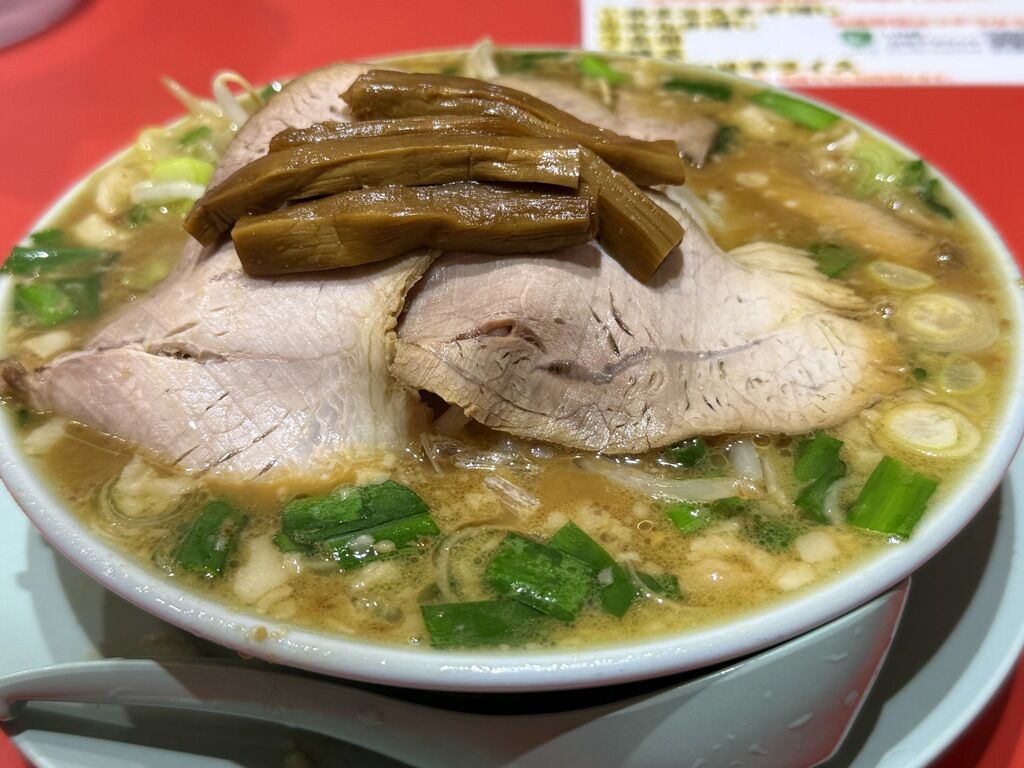 具はたっぷりのあまトロねぎ・もやし、これでもかという量のチャーシュー、めんま。具が立体的な盛り付けでこんもりと山盛りに。