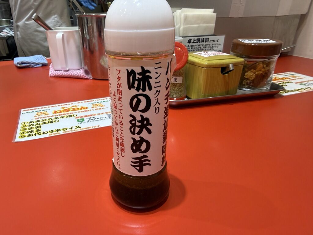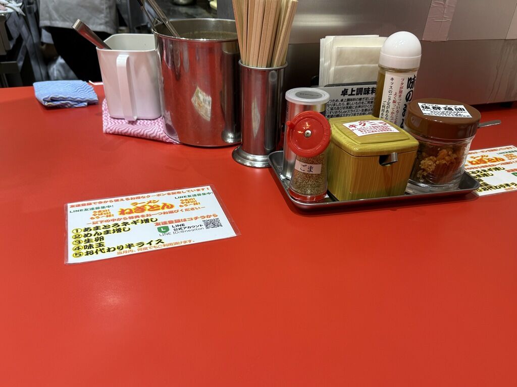 箸は割り箸。卓上調味料は卓上調味料・薬味はS&Bラーメン胡椒、すり胡麻、キクニラ、抜群鶏油、ニンニク入り味の決め手。
