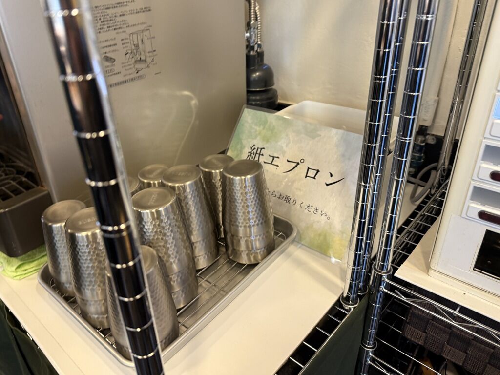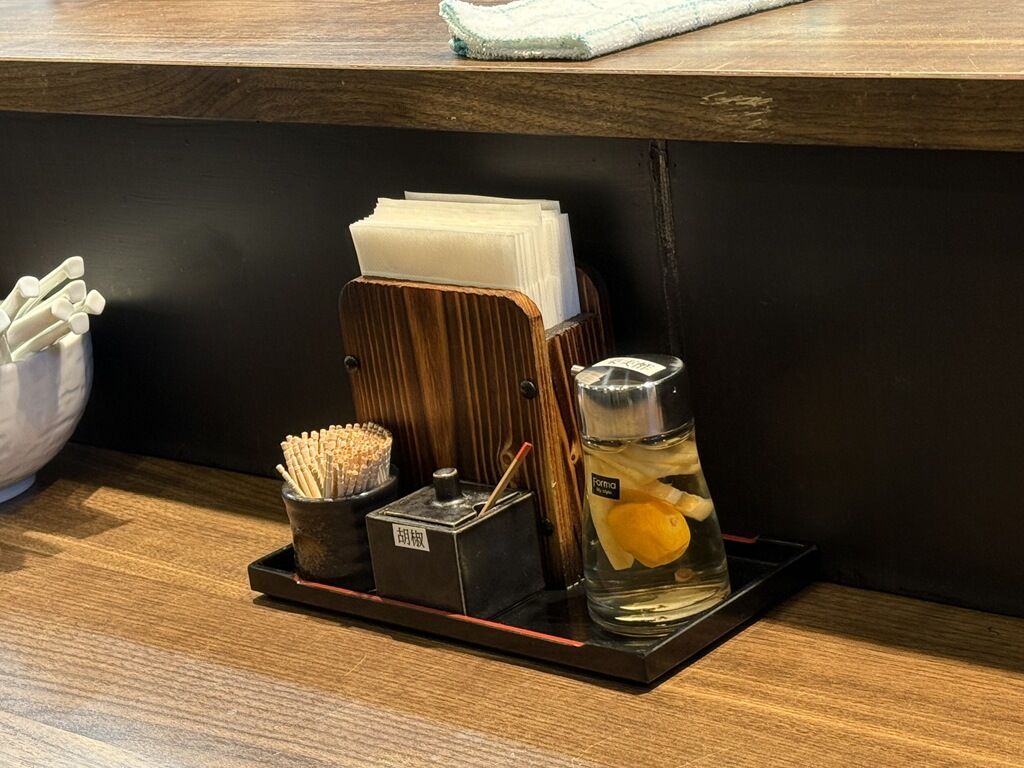 BGMはJ-POP、to the moon、他♪箸は割り箸。卓上調味料は胡椒、自家製果実酢。