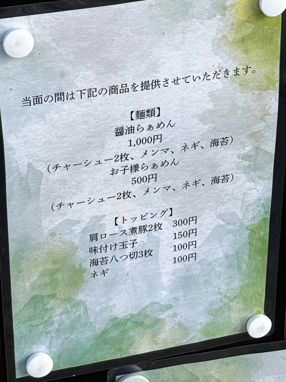当面の間醤油らぁめんのみ提供。
