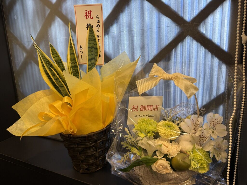 開店祝花は既に片付けられていますが、当初は麺ふじさき、麺処晴、らぁ麺瑞藤、長男もんたいちお、麦づら等錚々たる麺々からの花があったようです。