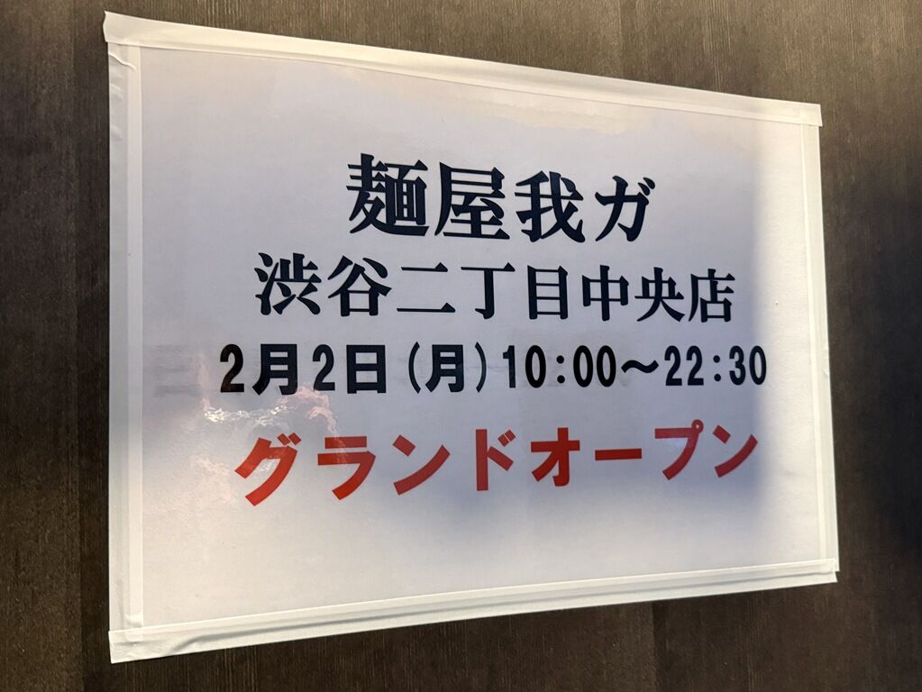 2026年2月2日本日オープンの新店「麺屋 我ガ 渋谷二丁目中央店」へ。