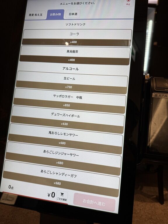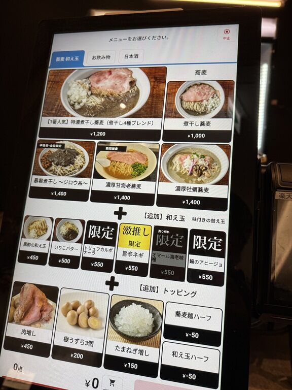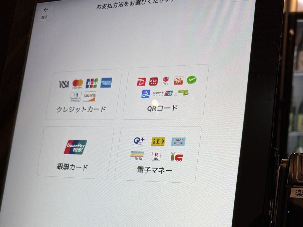 入店前にまず店頭タッチパネル券売機で食券購入です。なお、決済方式はキャッシュレスのみ、現金使用不可。
