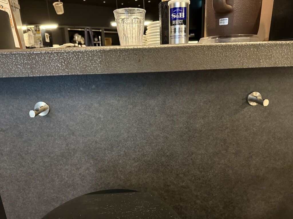 紙エプロンは申告制。カウンター下に荷物フックあり。券売機後ろに荷物かごあり。