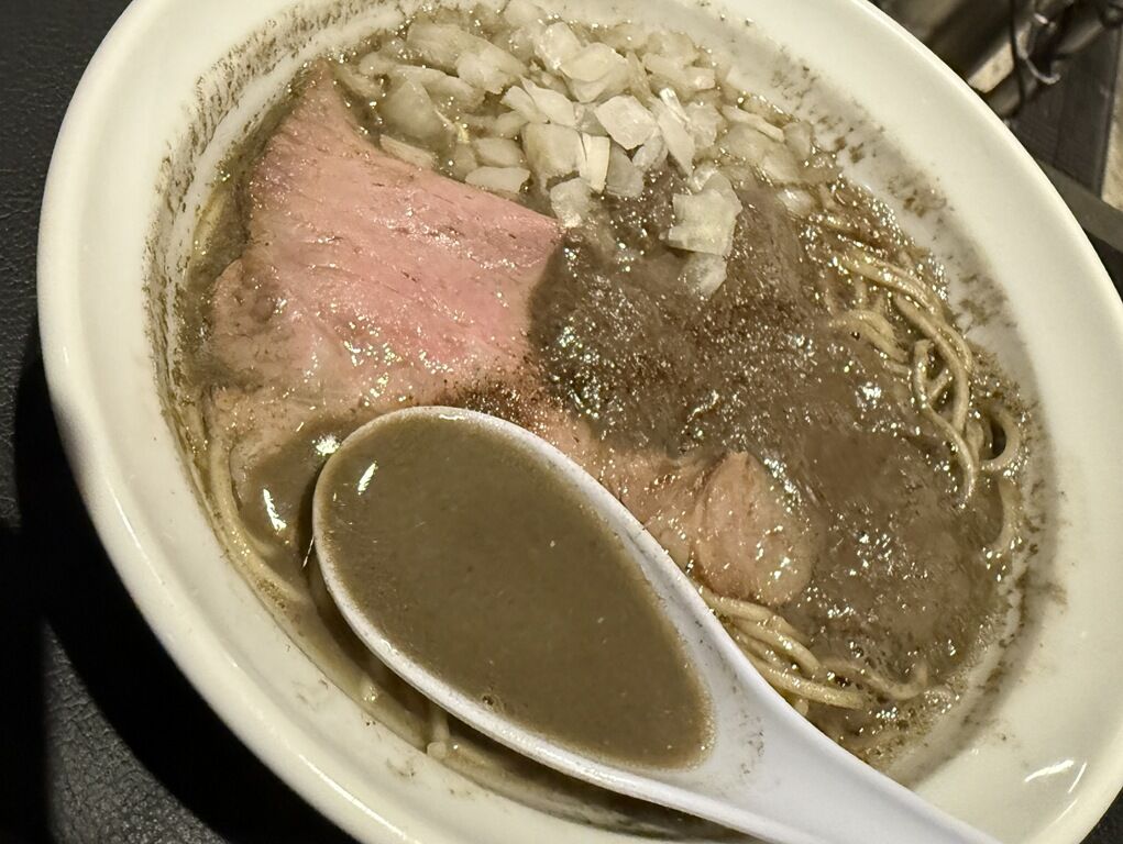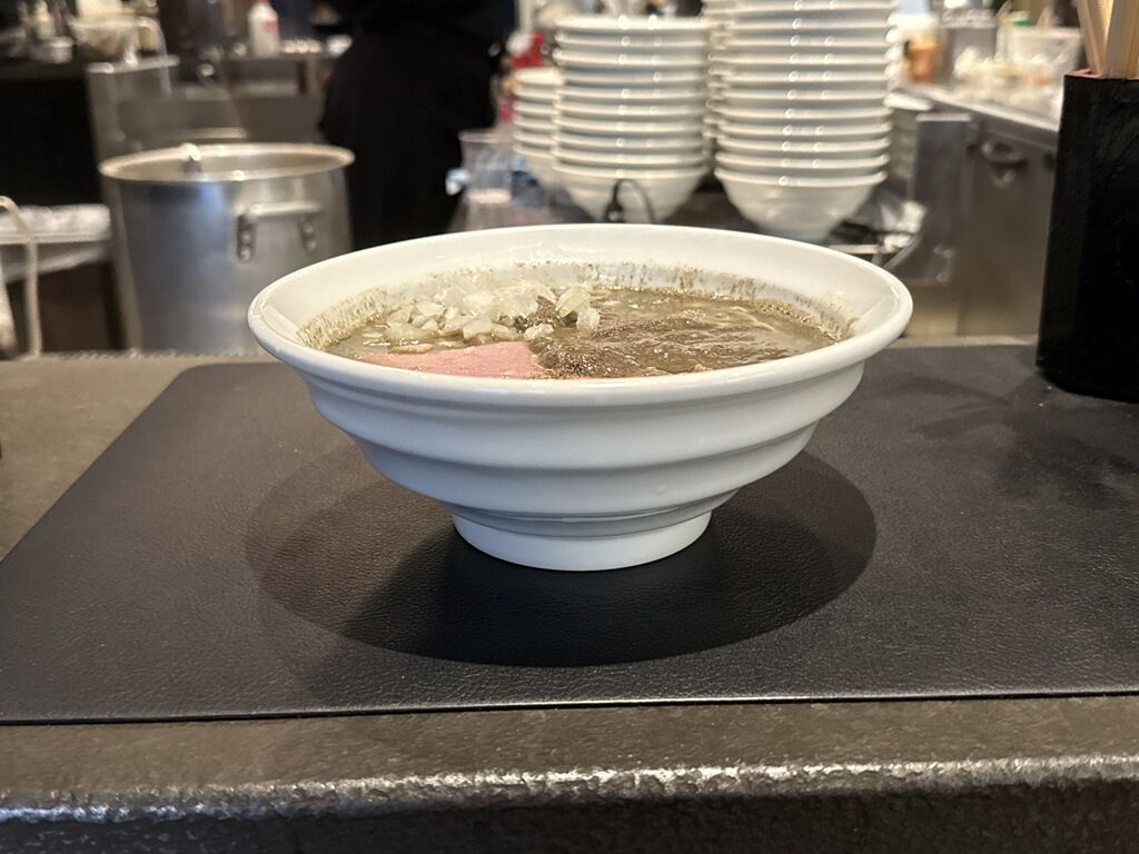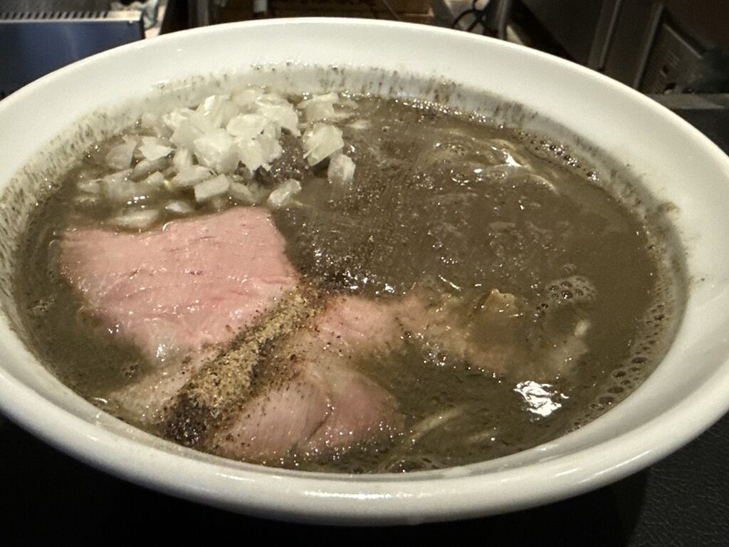 具はスライサーでカットした薄切り大判チャーシュー、きざみ玉ねぎ。チャーシューの上にドロドロの煮干しペースト、真っ直ぐラインを引く感じで煮干し粉。