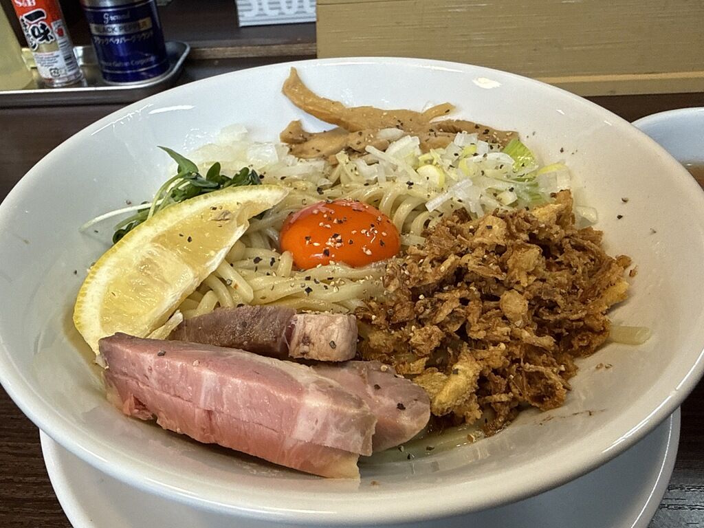 油そばの具は、チャーシュー、めんま、卵黄、フライドオニオン、カットレモン、カイワレ、きざみねぎ・玉ねぎ。仕上げに上から多めのブラックペッパー、具沢山で華やかなビジュアル。