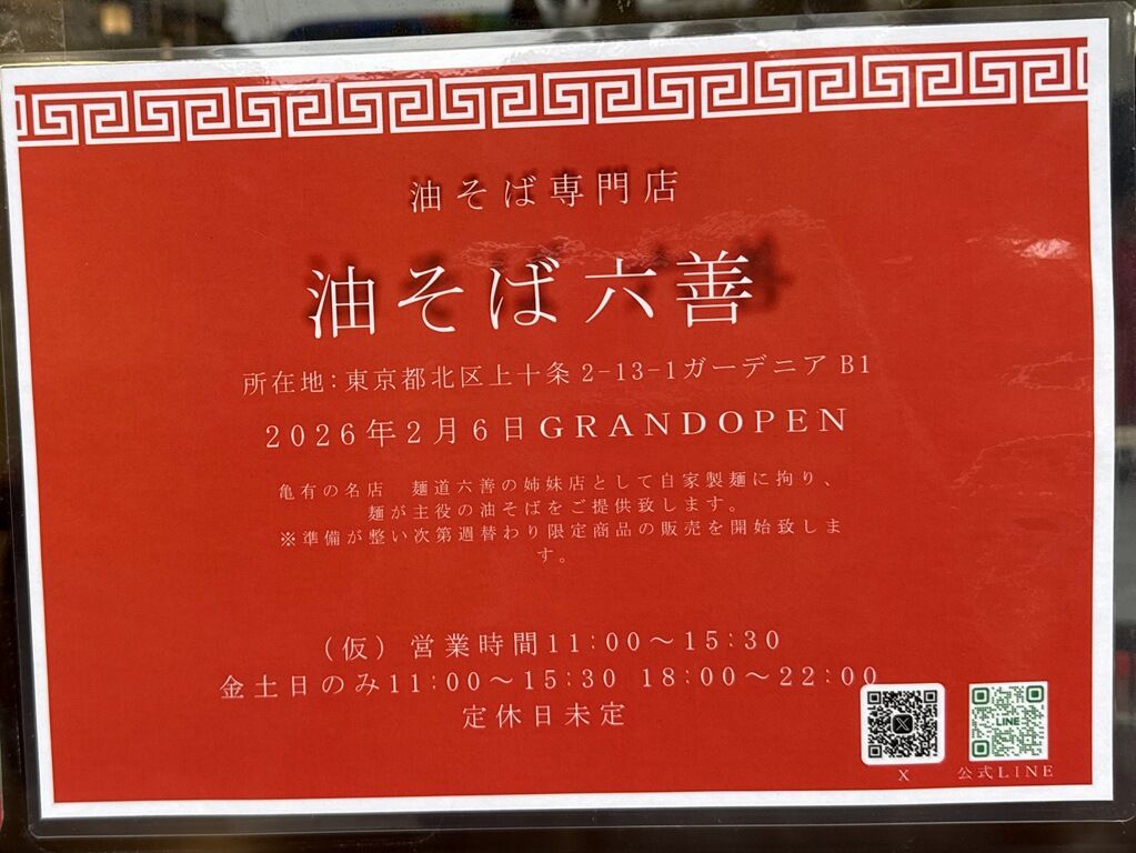 2026年2月7日、十条の新店「油そば 六善」へ。