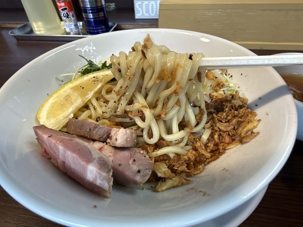 自家製の麺はストレート中太タイプ。ツルシコ食感で麺単体で旨いです。ただ、濃いめのタレに対してやや麺線が細めなのと、「麺が主役」「拘りの自家製麺」と謳われているので、もっと個性的な(もっちもちだったり、あるいはゴワゴワだったり)、さらに存在感ある麺の方がより麺を楽しめると思います。