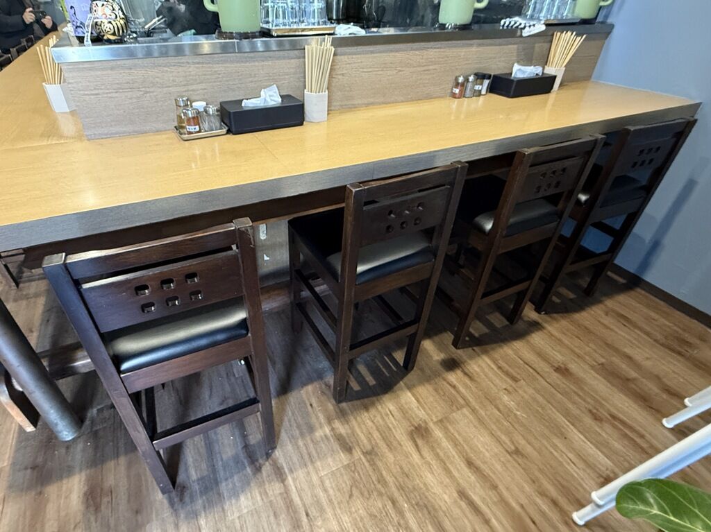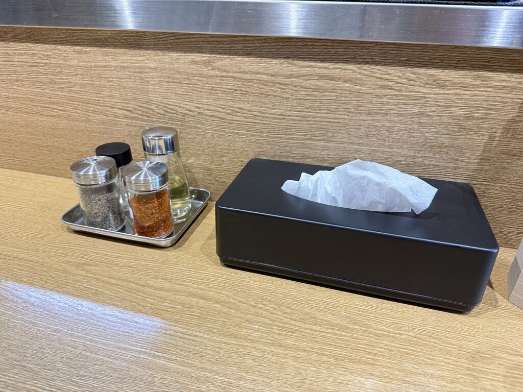 BGMはポップス♪箸は竹製の洗い箸でサスティナブルに配慮。卓上調味料は、ブラックペッパー、七味唐辛子、酢。