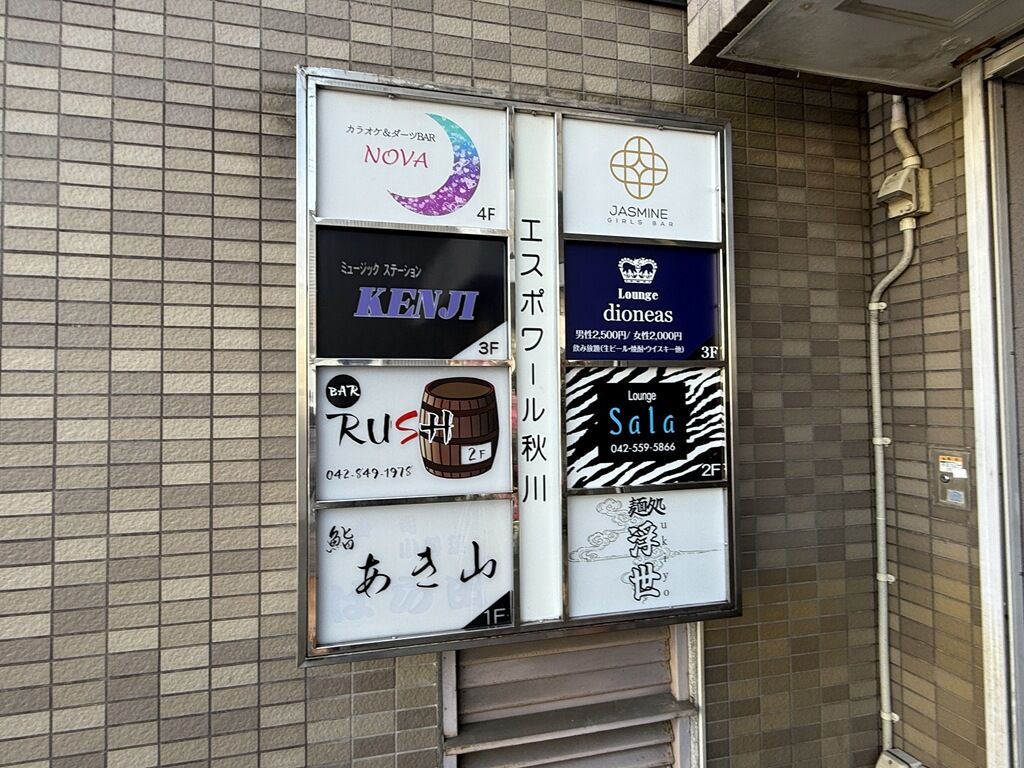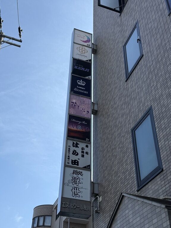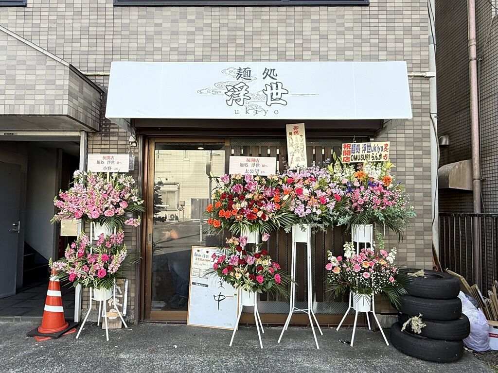店の場所は秋川駅北口徒歩約3分。「飛出汁ラーメン 太公望」の跡地。店頭開店祝花は太公望、三河屋製麺、他から。