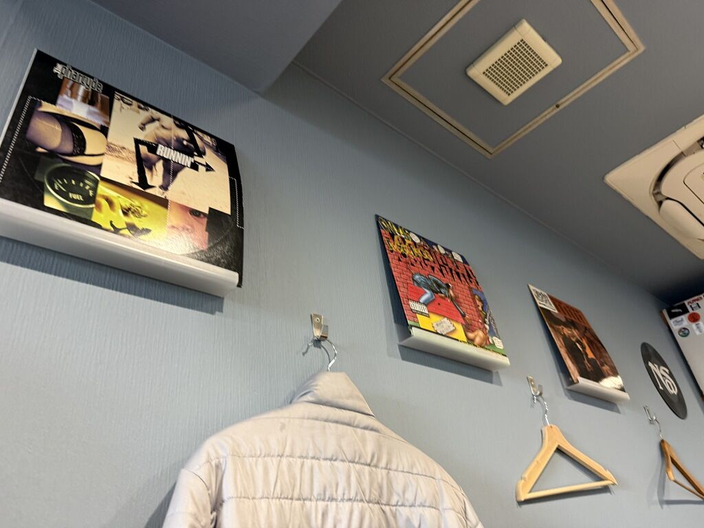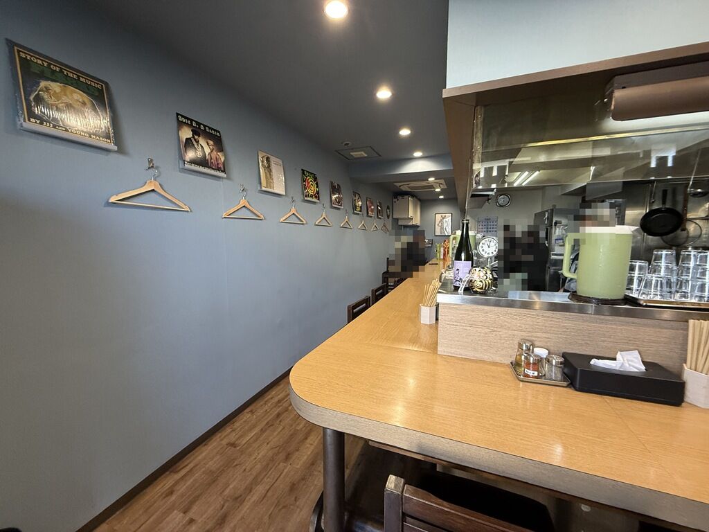 店内は厨房を囲むL字型カウンター10席(6・4)。カウンター下の棚は奥行きがあり、大きめの荷物が楽に入ります。壁面にはハンガー掛け。