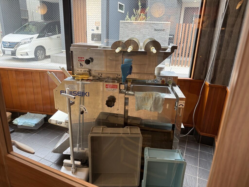 総席数26席とかなりの大箱店。路地側の出入口近くに、外と店内から見えるガラス張りの製麺室があります。中にはピカピカに磨かれた製麺機が鎮座。