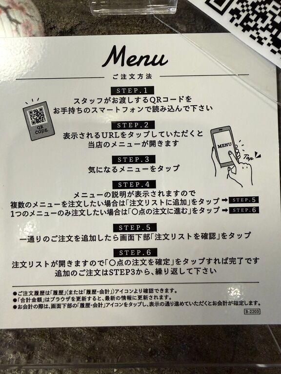 券売機はなくスマホでQRコードを読み取って注文、伝票方式、食後レジにて後会計制。