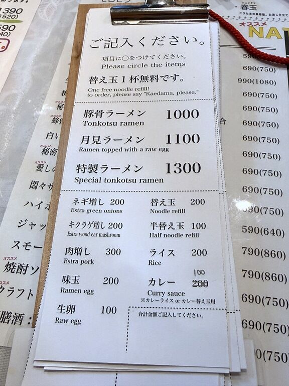 券売機は無くメニューを見てオーダーシートに記載して注文、先会計制。