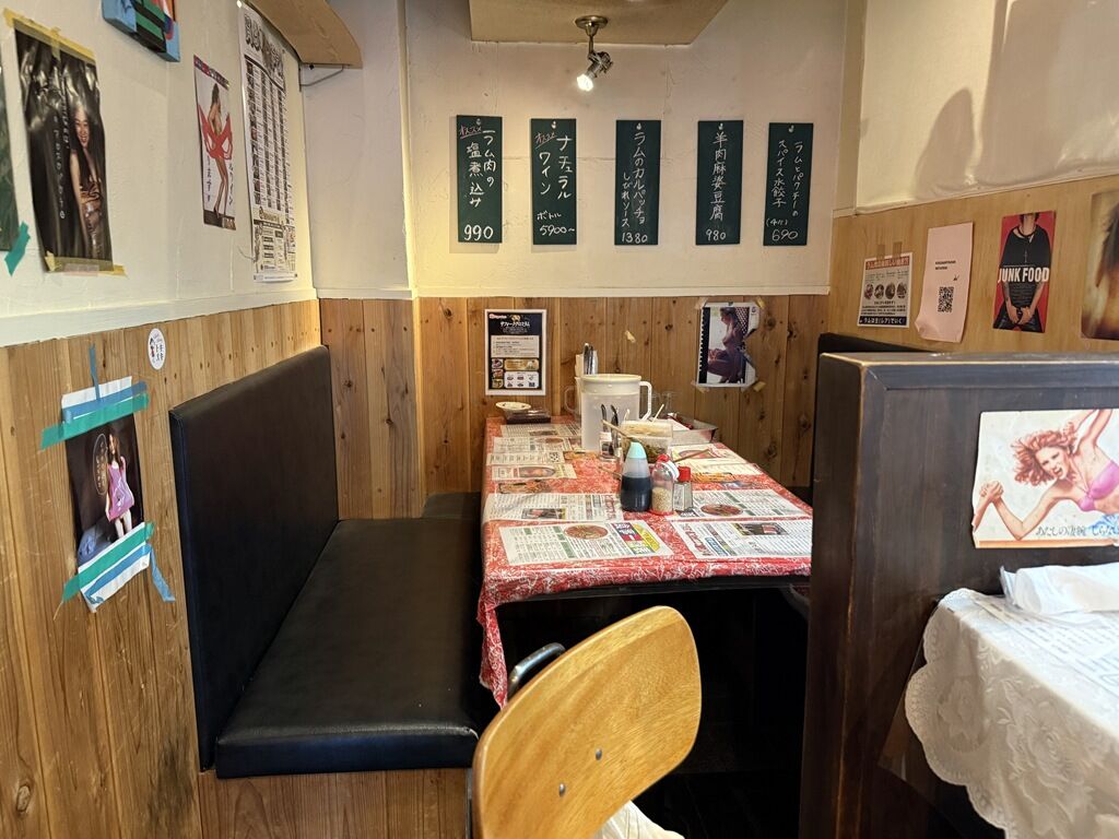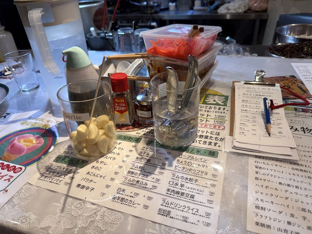 BGMは東京FM♪箸は割り箸。卓上調味料・薬味は、すり胡麻、クラッシュ粒生にんにく、ラーメンスープ(カエシ)、S&Bテーブルコショー、赤ダレ、紅しょうが、辛子高菜、辛らっきょう。