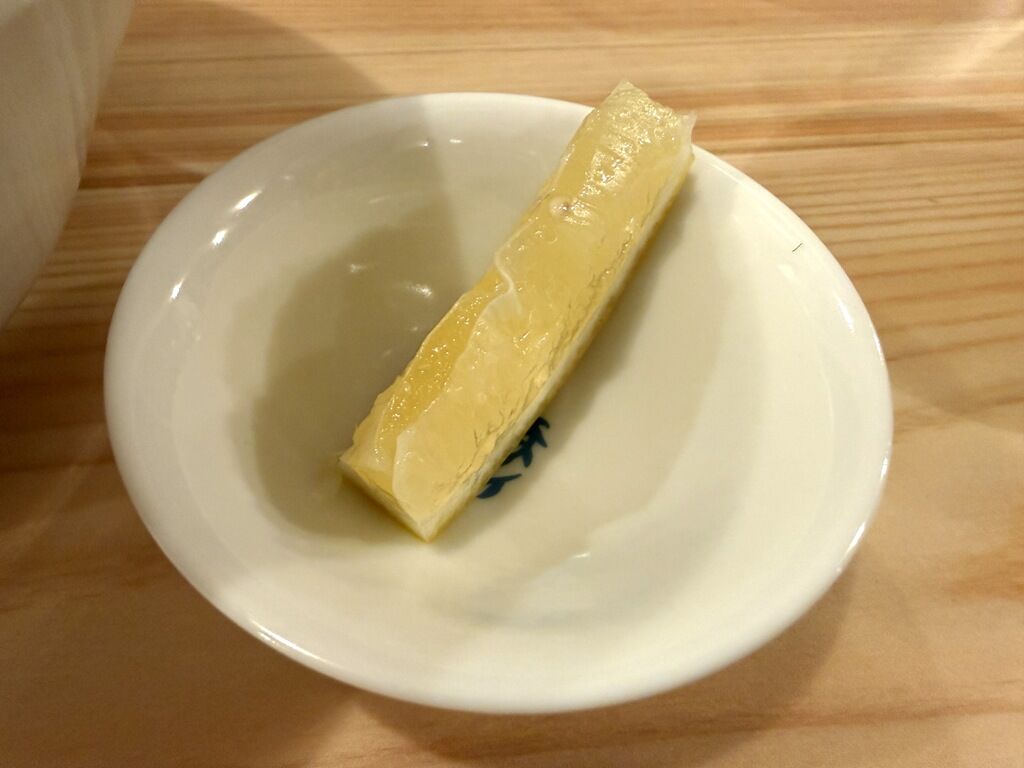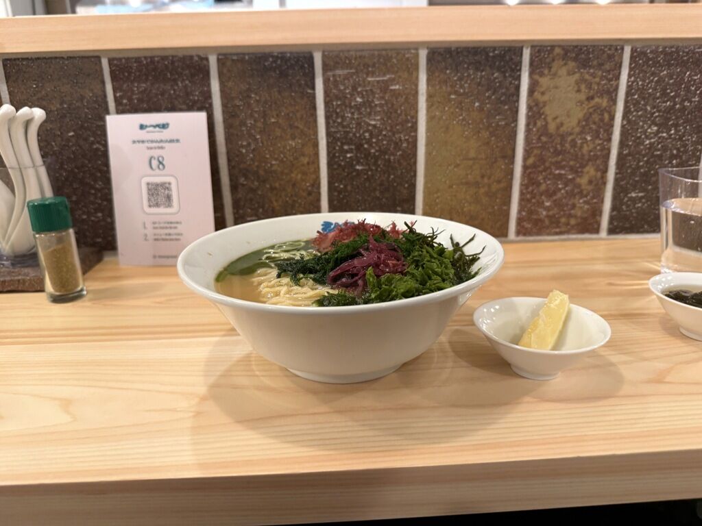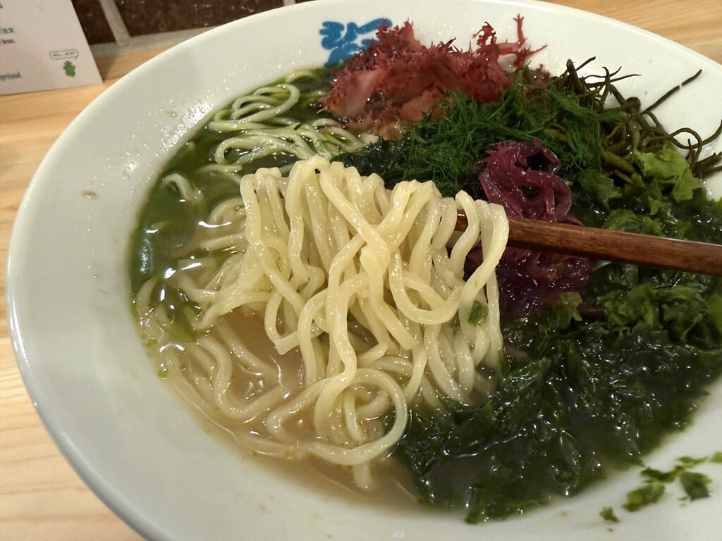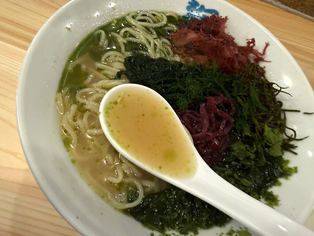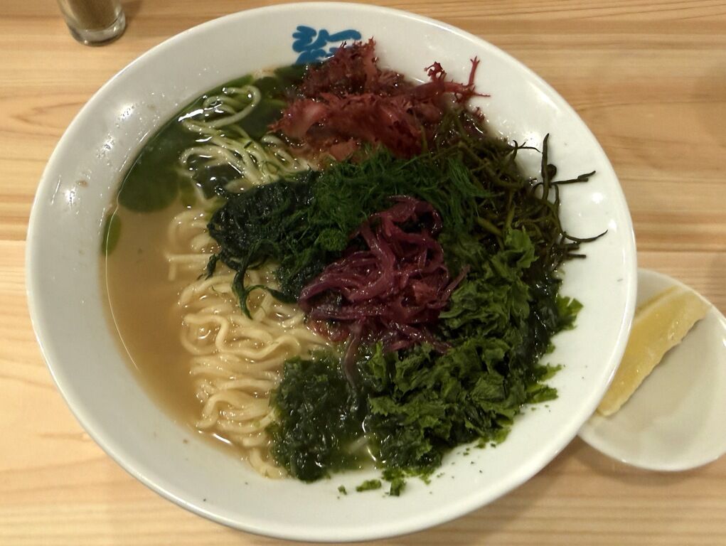 ですが、すぐ慣れて潮騒の香りに五感が洗われます。鯛の出汁に青のりしょうゆのスープですが、ほぼ海藻フレーバーに覆い尽くされて、シーベジダブル全開の味わい。あっさりさっぱりで、ヘルシー感もまざまざと感じられます。レモンでさらにさっぱりと、山椒でピリッと味変も楽しくてとても美味しい!