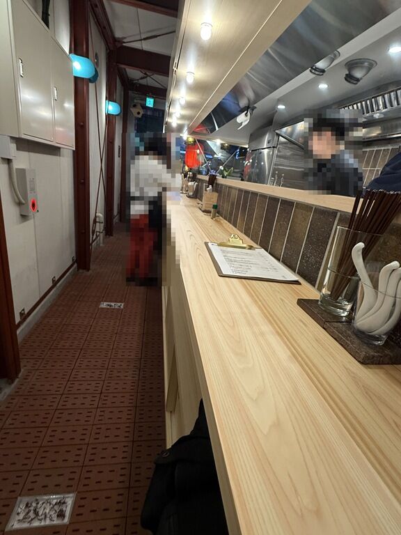 後客2。厨房に男性2、ホール担当女性2。箱ティッシュはカウンター下の棚にあり。