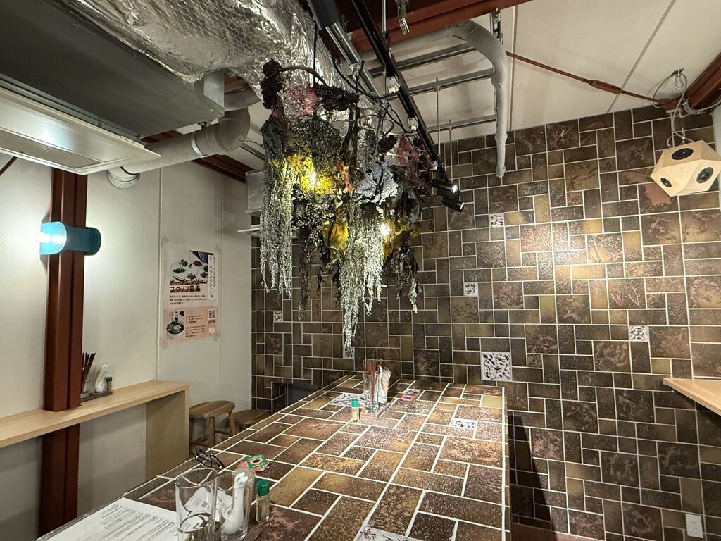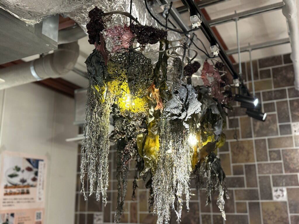 奥のテーブル上には、なんと「海藻シャンデリア」!