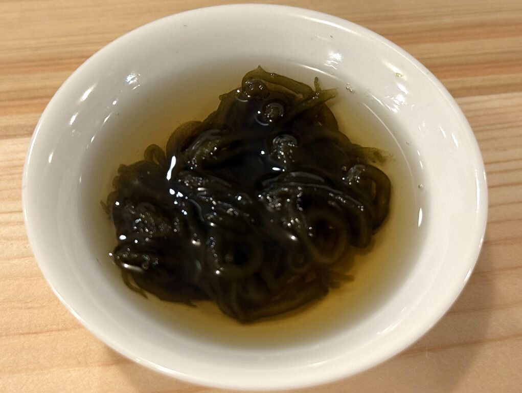 最初にお通し「乾杯もずく」酸味の効いたちょっと甘めのタレでさっはりと。