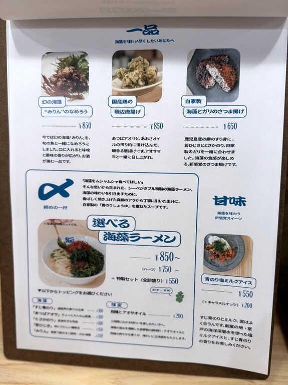 2026年3月2日オープン。昼は海藻を味わう「海藻ラーメン」、夜は海藻料理と各種お酒を楽しめる「海藻居酒屋」というお店。運営は合同会社シーベジタブル。