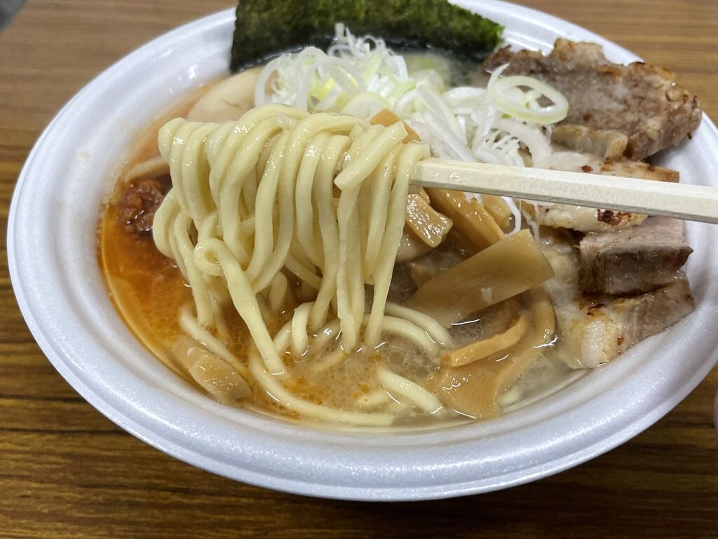 麺はストレート中細タイプ。久留米ラーメンてことで、博多ラーメンよりも若干太め。指定時間通りでコシのあるシャキッとしたコシのある食感が特徴。麺も十分旨いですが、スープのクオリティに比して、麺ははっきりとカップ麺の麺。スープがあまりに良すぎて、生麺入れたい衝動に。