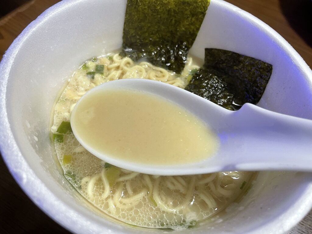 スープは軽く豚骨臭のする白濁豚骨。ぶっちゃけていうと超絶美味。ちゃんとした丼に入ってお店で出されたら、違和感まるで無いかも。それほど旨くて、紅生姜や辛子高菜や胡麻とか、いろいろ用意しておけばさらに楽しめたのにって思った程。旨すぎて飲み干しちゃってから、あ゛~ご飯入れればよかったって思っちゃたり。美味いにも程があるってレベルですごく美味しい!