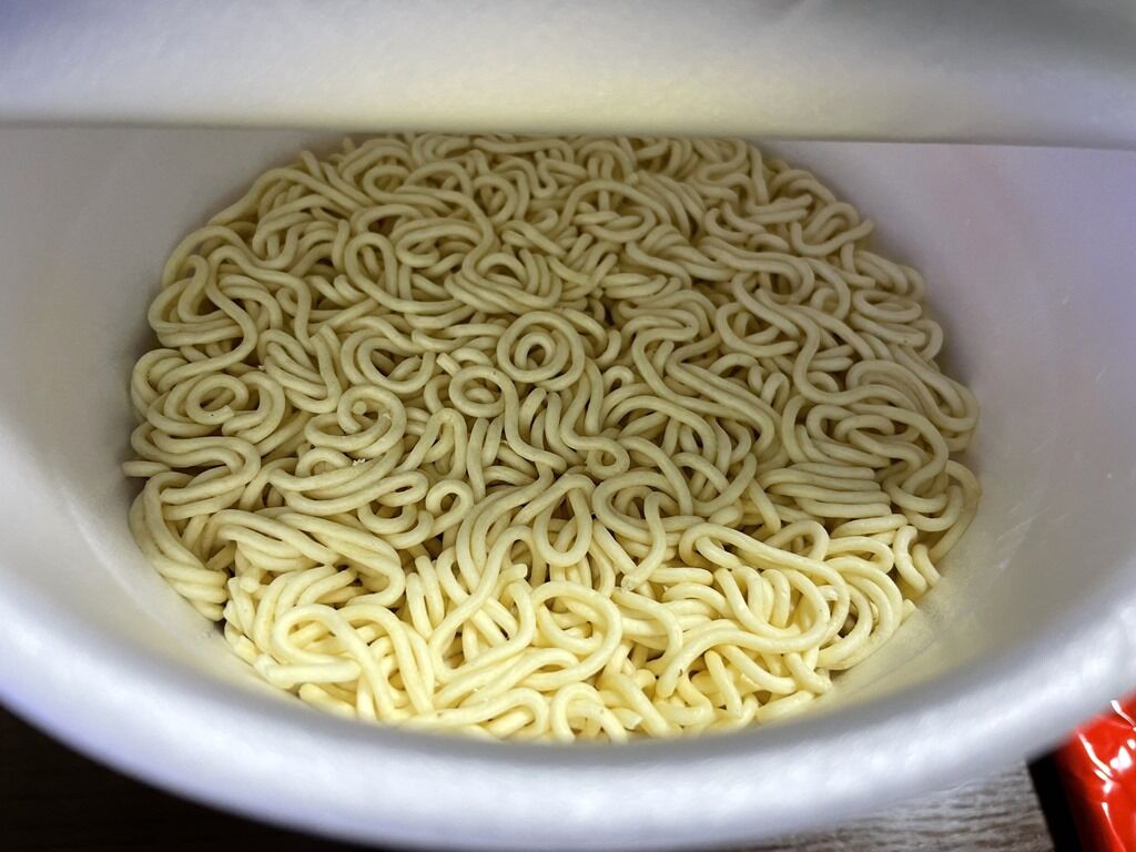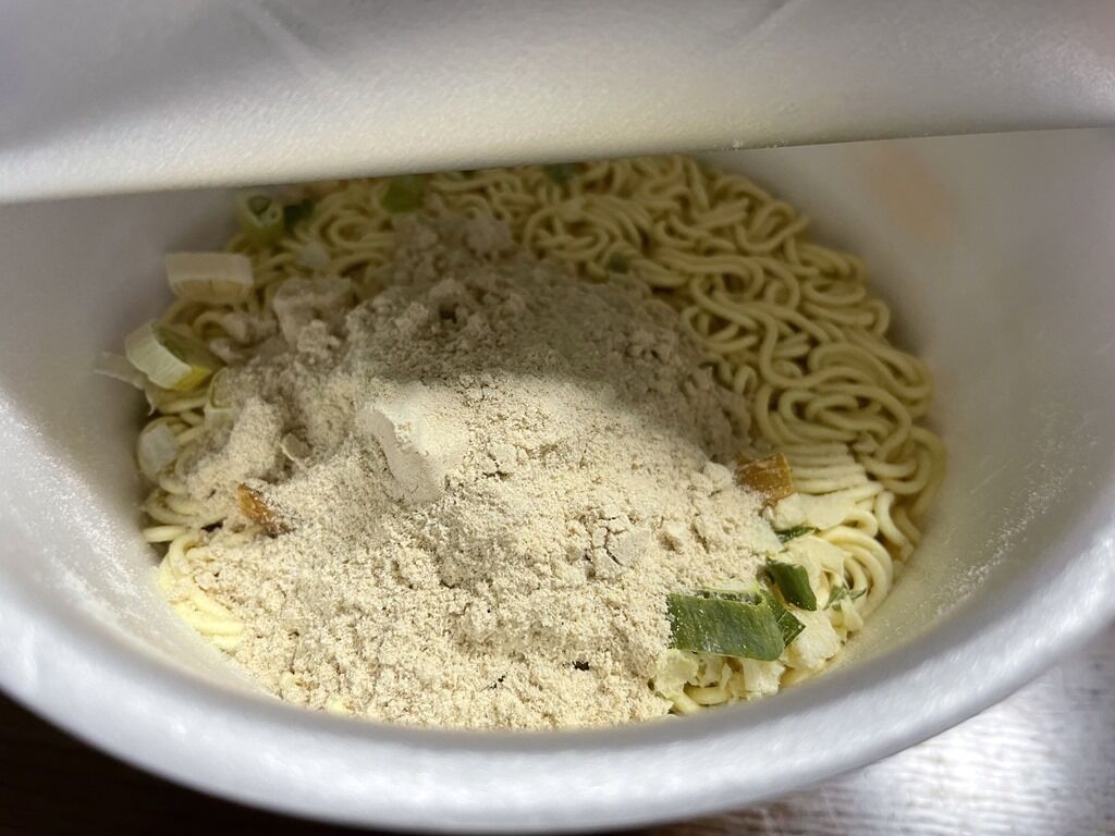 パッケージには、スープが溶けやすいように、まずかやく、それから粉末スープを入れるようにとのアドバイスあり。最近のカップ麺は粉末スープも後入れが多い気がしますが、粉末スープ先入れは久々で新鮮。