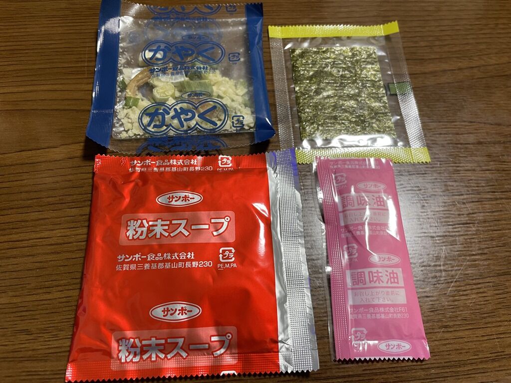 内容は、先入れのかやくと粉末スープ。後入れの調味油と有明海苔。