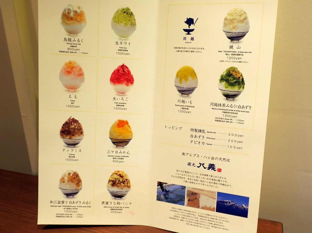 券売機は無く後会計制。メニューは烏龍みるく800円、生キウイ1000円、もも1000円、生いちご1200円、ティラミス1000円、三ケ日みかん900円、和三盆蜜と白あずきみるく1000円、黒蜜きな粉バニラ900円。川越の食材を活かしたかき氷は、鏡山1200円、川越いも1200円、河越抹茶みるくと白あずき1200円。